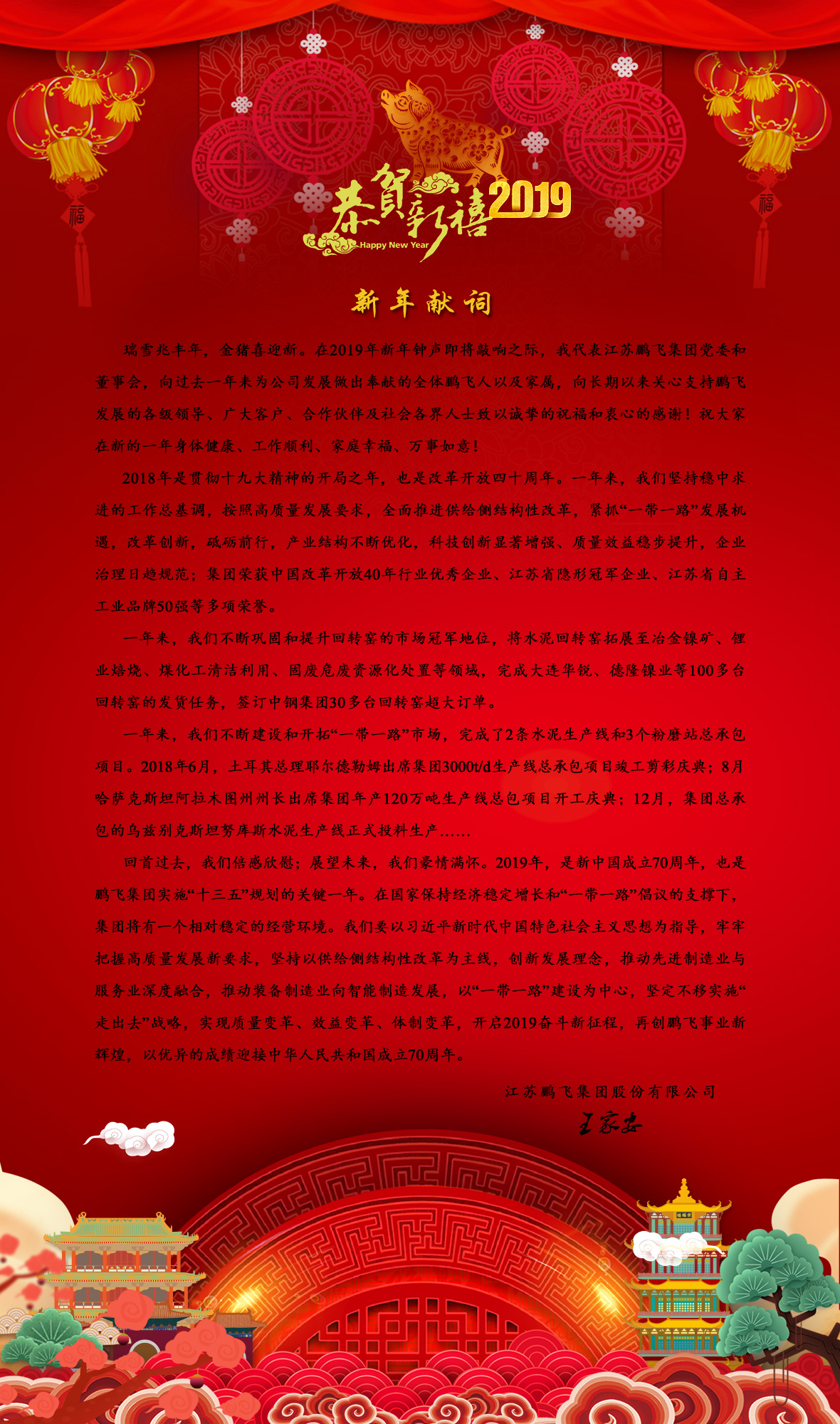 瑞雪兆豐年,金豬喜迎新。在2019年新年鐘聲即將敲響之際,我代表江蘇鵬飛集團(tuán)黨委和董事會(huì),向過去一年來為公司發(fā)展做出奉獻(xiàn)的全體鵬飛人以及家屬,向長期以來關(guān)心支持鵬飛發(fā)展的各級(jí)領(lǐng)導(dǎo)、廣大客戶、合作伙伴及社會(huì)各界人士致以誠摯的祝福和衷心的感謝!祝大家在新的一年身體健康、工作順利、家庭幸福、萬事如意!