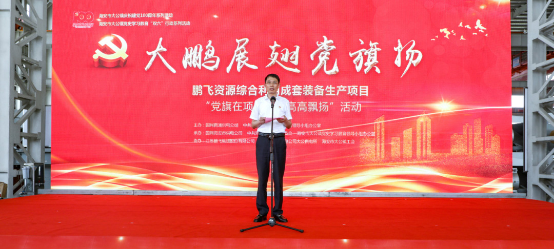 “今天活動(dòng)現(xiàn)場(chǎng)的‘鵬飛資源綜合利用成套裝備生產(chǎn)項(xiàng)目’是2021年江蘇省重大項(xiàng)目,南通市‘黨旗在項(xiàng)目一線高高飄揚(yáng)’活動(dòng)第一批啟動(dòng)項(xiàng)目。為了著力提升服務(wù)效能,健全重大項(xiàng)目服務(wù)機(jī)制,大公鎮(zhèn)牽頭組織成立項(xiàng)目臨時(shí)黨支部、項(xiàng)目服務(wù)專班,一刻不停推項(xiàng)目,讓黨旗飄揚(yáng)在項(xiàng)目一線;一著不讓抓發(fā)展,讓黨員沖鋒在項(xiàng)目一線;一以貫之優(yōu)環(huán)境,讓服務(wù)下沉到項(xiàng)目一線,著力辦實(shí)事、解難題,為推進(jìn)重大項(xiàng)目建設(shè)提供有力支撐和堅(jiān)實(shí)保障。”大公鎮(zhèn)黨委書記金山存說。