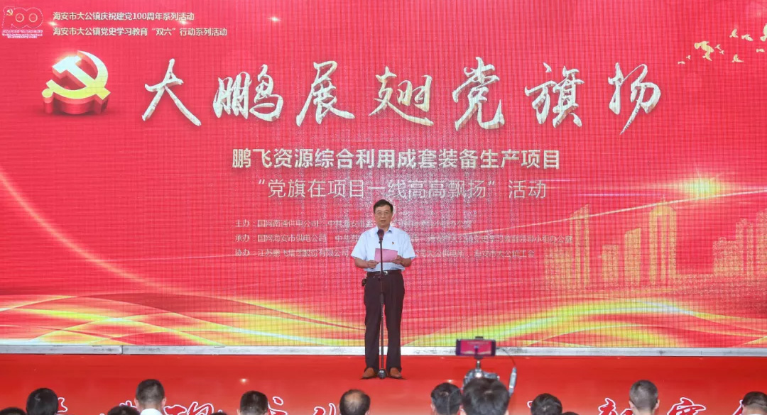 鵬飛資源綜合利用成套裝備生產(chǎn)項(xiàng)目是南通市第一批“黨旗在項(xiàng)目一線高高飄揚(yáng)”啟動(dòng)項(xiàng)目,由國(guó)網(wǎng)南通供電公司掛鉤聯(lián)系。“國(guó)網(wǎng)南通供電公司黨委把開展黨史學(xué)習(xí)教育作為一項(xiàng)重大政治任務(wù),發(fā)揮優(yōu)勢(shì)、凸顯特色,推動(dòng)黨史學(xué)習(xí)教育與項(xiàng)目建設(shè)、服務(wù)企業(yè)辦實(shí)事等重點(diǎn)工作深度融合,做到建強(qiáng)堡壘,黨旗飄在項(xiàng)目一線;舉旗亮徽,黨員沖在項(xiàng)目一線設(shè)崗定責(zé),服務(wù)下沉項(xiàng)目一線。”國(guó)網(wǎng)南通供電公司副總經(jīng)理李秋實(shí)介紹如何國(guó)網(wǎng)公司將服務(wù)下沉項(xiàng)目一線時(shí)說道。