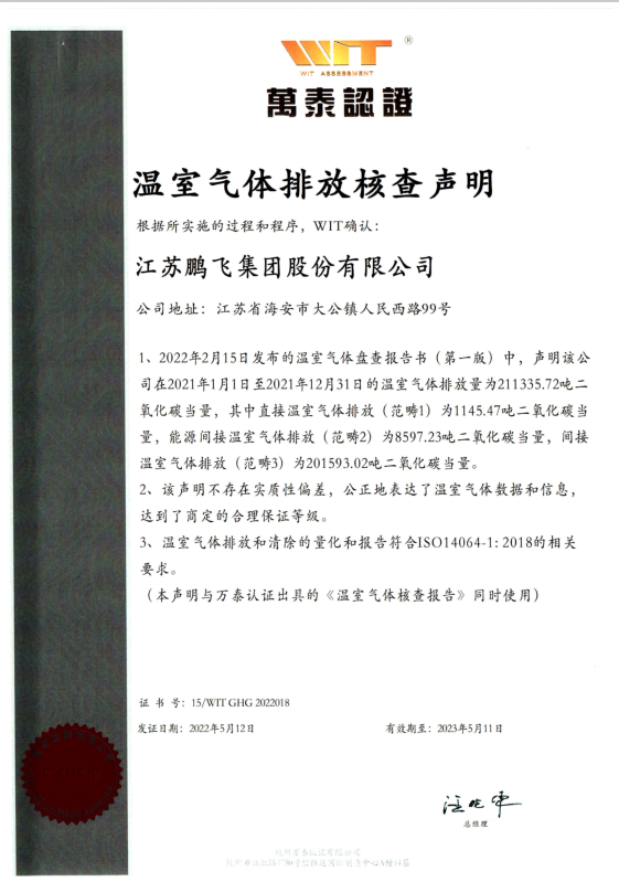 江蘇鵬飛集團股份有限公司一直以來堅持綠色采購,綠色生產(chǎn),綠色物流的原則,積極響應(yīng)并參與相關(guān)方(政府、客戶等)節(jié)能降排、碳排放報告活動。
