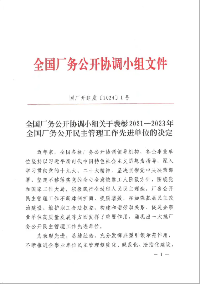 近日,全國(guó)廠務(wù)公開(kāi)協(xié)調(diào)小組印發(fā)《關(guān)于表彰2021-2023年全國(guó)廠務(wù)公開(kāi)民主管理工作先進(jìn)單位的決定》,江蘇鵬飛集團(tuán)股份有限公司被表彰為全國(guó)廠務(wù)公開(kāi)民主管理工作先進(jìn)單位。