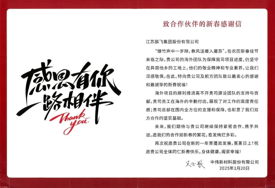 江蘇鵬飛集團(tuán)在項(xiàng)目履約中用行動做到客戶滿意,以優(yōu)質(zhì)履約作為品牌支撐,收到來自客戶的感謝信。信中,客戶對我司交付的項(xiàng)目質(zhì)量和效率表達(dá)了高度肯定和認(rèn)可,更對鵬飛項(xiàng)目負(fù)責(zé)團(tuán)隊的認(rèn)真負(fù)責(zé)態(tài)度、專業(yè)技術(shù)能力、高效執(zhí)行能力給予了高度的評價和贊賞。