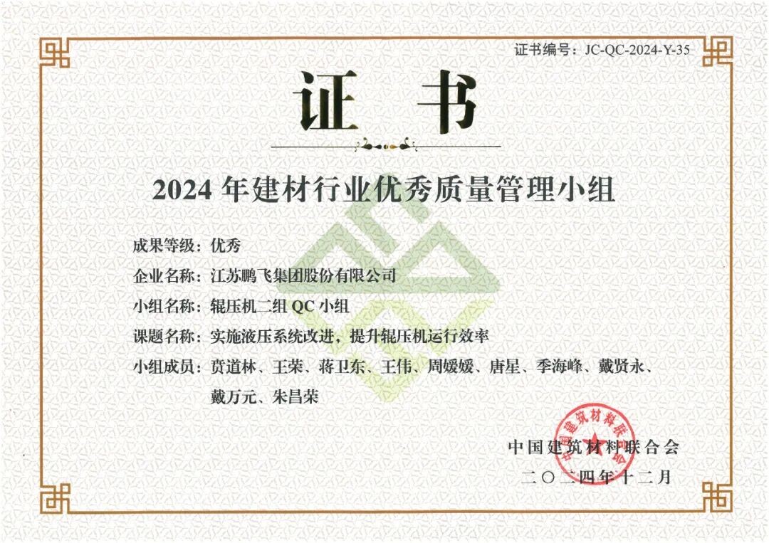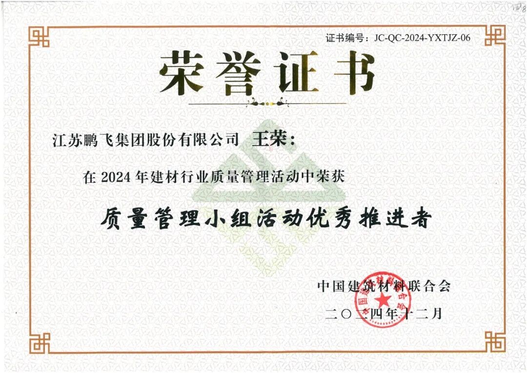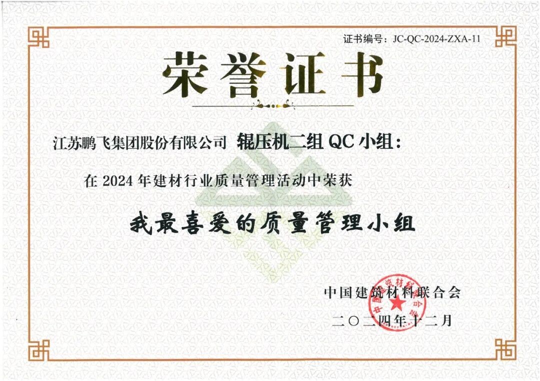 會議為2024年建材行業(yè)質量管理活動優(yōu)秀質量管理成果、先進個人和優(yōu)秀組織,2024年建材行業(yè)質量管理活動“我最喜愛的質量管理小組”和“我最喜愛的質量信得過班組”,以及2024年度建材行業(yè)“三品”典型案例的獲得者頒發(fā)證書。鵬飛多項成果榮獲佳績。