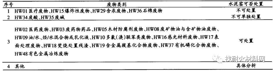 危險廢棄物種類繁多,成分復(fù)雜,存在多種形態(tài),在利用水泥窯進(jìn)行處置時必須遵守兩個基本準(zhǔn)則,其一:處置要絕對安全可靠,不能帶來新的環(huán)境污染或污染轉(zhuǎn)移;其二:不能影響水泥熟料正常的生產(chǎn)質(zhì)量。大量實驗研究及工業(yè)化試生產(chǎn)實踐證實,水泥窯可以處置的類別有:廢酸、廢堿、有機(jī)溶劑廢物、乳化液、固體危險廢物、醫(yī)藥廢物、廢藥物藥品、精餾殘渣、廢礦物油等,約占《國家危險廢物名錄》總數(shù)的50%左右。各類危廢是否可采用水泥窯處置的具體分類見表2。