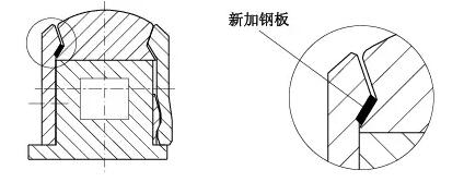骨架密封厚度15mm,拆下壓蓋用車床將骨架密封擋邊車薄5mm,壓蓋密封槽深度由18mm加深到23mm(見圖4)。此法使得骨架密封在高速軸上的安裝位置向外移動5mm,避開高速軸上的溝槽。經此處理,解決了漏油問題,可以正常生產,等到計劃檢修停機時,再徹底處理高速軸上的溝槽。