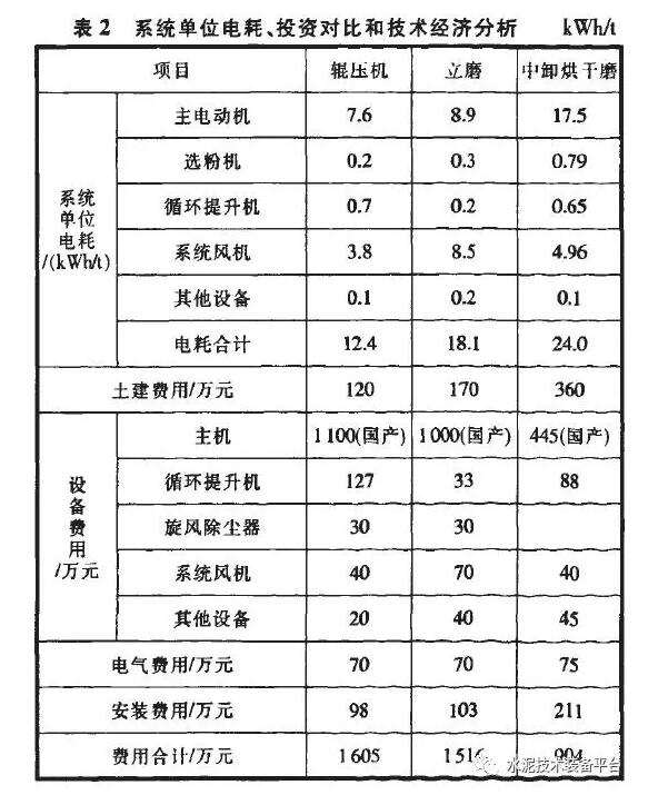 3種生料終粉磨系統(tǒng)主機設備對比見表1,單位電耗、投資及技術經濟分析見表2。