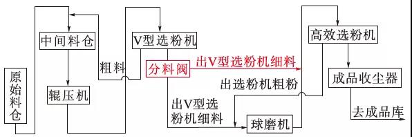 圖3 兩路分料閥3 試驗(yàn)步驟(1)在設(shè)備運(yùn)行穩(wěn)定、產(chǎn)質(zhì)量正常情況下,出V型選粉機(jī)微粉全部入磨機(jī),即以聯(lián)合粉磨方式為基準(zhǔn),簡(jiǎn)稱(chēng)為試驗(yàn)1;
