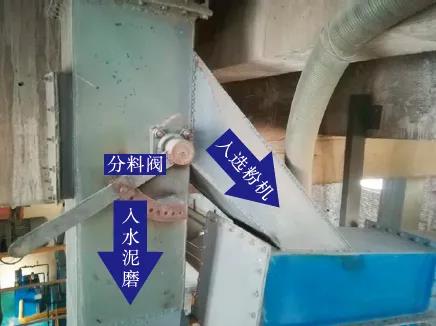 2 粉磨流程改進(jìn)我們?cè)诔鯲型選粉機(jī)與入磨溜子之間安裝可調(diào)節(jié)翻板式分料閥(以下簡(jiǎn)稱(chēng)分料閥),該分料閥可將物料分為兩路,一路入磨機(jī),另一路經(jīng)空氣輸送斜槽入高效選粉機(jī),同時(shí),該分料閥還可進(jìn)行10格調(diào)節(jié)(0%~100%)。試驗(yàn)前后工藝流程簡(jiǎn)圖及照片分別見(jiàn)圖1~圖3。