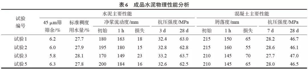 由表5和表6可以看出,成品水泥隨著產(chǎn)量的增加,相對(duì)基準(zhǔn)試驗(yàn)1,試驗(yàn)2和試驗(yàn)3中<3 μm和3~32 μm顆粒含量增加,≥32 μm顆粒含量減少,特征粒徑X'和中位徑D50變小,均勻性系數(shù)n增大,顆粒分布更為集中;在比表面積基本相同情況下,成品水泥的凈漿經(jīng)時(shí)損失和混凝土坍落度損失增大,說(shuō)明成品水泥與外加劑的相容性變差,但水泥和混凝土的抗壓強(qiáng)度有所提高。