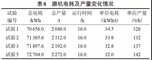 5 效益分析試驗(yàn)過(guò)程中粉磨系統(tǒng)的電耗及產(chǎn)量變化見(jiàn)表8。