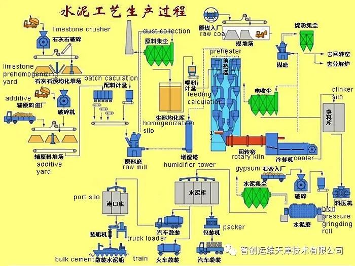 4.生產(chǎn)工藝:硅酸鹽水泥生產(chǎn)的大體步驟是:先把幾種原材料按適當?shù)谋壤浜虾煤笤谀C中磨成生料;然后將制得的生料入窯進行煅燒;再把燒好的熟料配以適當?shù)氖啵ê突旌喜牧希┰谀C中磨成細粉,即得水泥。硅酸鹽系水泥的生產(chǎn)概括起來就是“兩磨一燒”。生料制備:石灰質(zhì)原料,粘土質(zhì)原料與少量校正原料經(jīng)破碎后,按一定比例配合、磨細,并配合為成分合適,質(zhì)量均勻的生料熟料煅燒:生料在水泥窯內(nèi)煅燒至部分熔融所得以硅酸鈣為主要成分的硅酸鹽水泥熟料水泥粉磨:熟料加適量石膏,有時還加適量混合材料或外加劑共同磨細為水泥生產(chǎn)方法①干法生產(chǎn) 將原料同時烘干并粉磨,或先烘干經(jīng)粉磨成生料粉后喂入干法窯內(nèi)煅燒成熟料的方法。但也有將生料粉加入適量水制成生料球,送入立波爾窯內(nèi)煅燒成熟料的方法,稱之為半干法,仍屬干法生產(chǎn)之一種。②濕法生產(chǎn) 將原料加水粉磨成生料漿后,喂入濕法窯煅燒成熟料的方法。也有將濕法制備的生料漿脫水后,制成生料塊入窯煅燒成熟料的方法,稱為半濕法,仍屬濕法生產(chǎn)之一種。 干法和濕法生產(chǎn)特點①干法生產(chǎn)特點:干法是將生料粉直接送入窯內(nèi)煅燒,入窯生料的含水率一般僅1%~2%,省去了烘干生料所需的大量熱量。不僅可以制備出質(zhì)量均勻的生料而且逐步向大型方向發(fā)展?,F(xiàn)在將懸浮預熱和預分解窯統(tǒng)稱為新型干法窯,它們成為干法生產(chǎn)今后發(fā)展的方向。②濕法生產(chǎn)特點:將生料制成含水32%一36%的料漿,在回轉(zhuǎn)窯內(nèi)將生料漿烘干并燒成熟料。濕法制備料漿,粉磨能耗較低,約低30%,料漿容易混勻,生料成分穩(wěn)定,有利于燒出高質(zhì)量的熟料。但球磨機易磨件的鋼材消耗大,熟料出窯溫度較低,不宜燒高硅酸率和高鋁氧率的熟料。